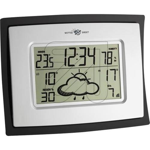 Con la tecnologia Direct Meteo: Previsioni del tempo regionale per diverse aree, creato da meteorologi professionisti, utilizzando la tecnologia satellitare a una rete wireless specifica per la vostra stazione, previsioni del tempo per oggi, da un timer regolabile per il giorno successivo, la presentazione dettagliata con 24 icone meteorologiche diverse visualizzare gli alti e bassi, attesi probabilità pioggia, ore di sole al giorno, la temperatura e l'umidità interna, ora e data, la misurazione di temperatura: 0 ... 60 ° C, umidità 1 ... 99%, da appendere, (batterie 2 x 1 5V AA non incluse, trasmettitore di temperatura esterna può essere collegata 30.3156.WD non incluso).Le dimensioni del prodotto:165 x 220 x 30 mm, 398 g